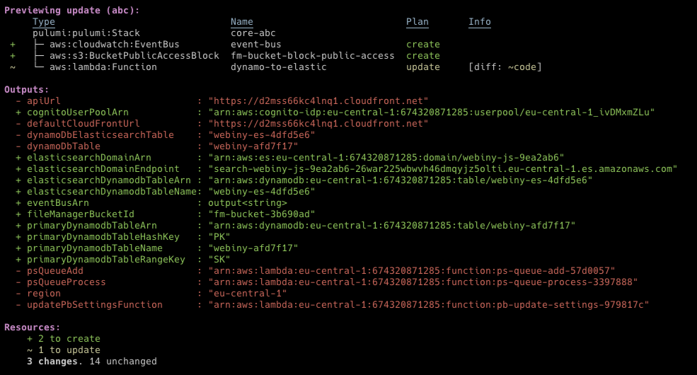 Note that the above preview doesn’t show us the changes that were potentially applied via the apps/api/webiny.application.ts file on your behalf. If any, you should additionally inspect the preview output and ensure changes you had in place are also intact.