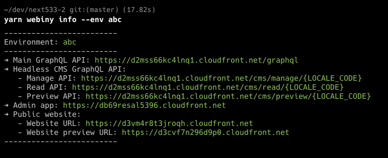 With the Website application, we’ve completed the Pulumi state files migration. The only thing left to do is manually test the re-deployed system and ensure everything is working as expected. To get started, we suggest running the yarn webiny info --env xyz command, and opening the Admin application in your browser: